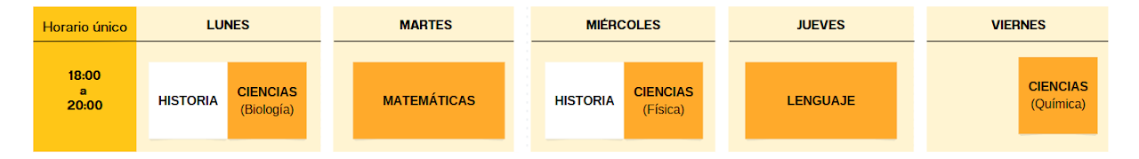Estas se realizan en horario de 18:00 a 20:00, de lunes a viernes, bajo el esquema adjunto abajo.